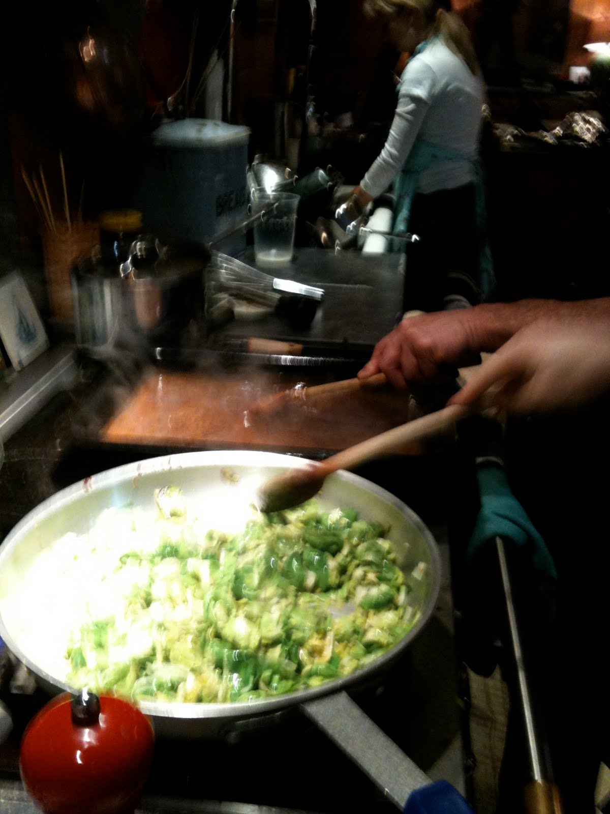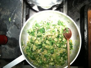 melt the butter in a pan and add some olive oil. add the sprout leaves and saute until beginning to get tender: