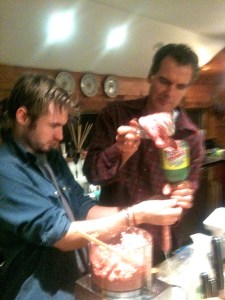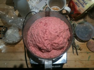 then take the ground meat out of the fridge and in a food processor, blend the meat and the spice mixture together. until its totally mixed!: