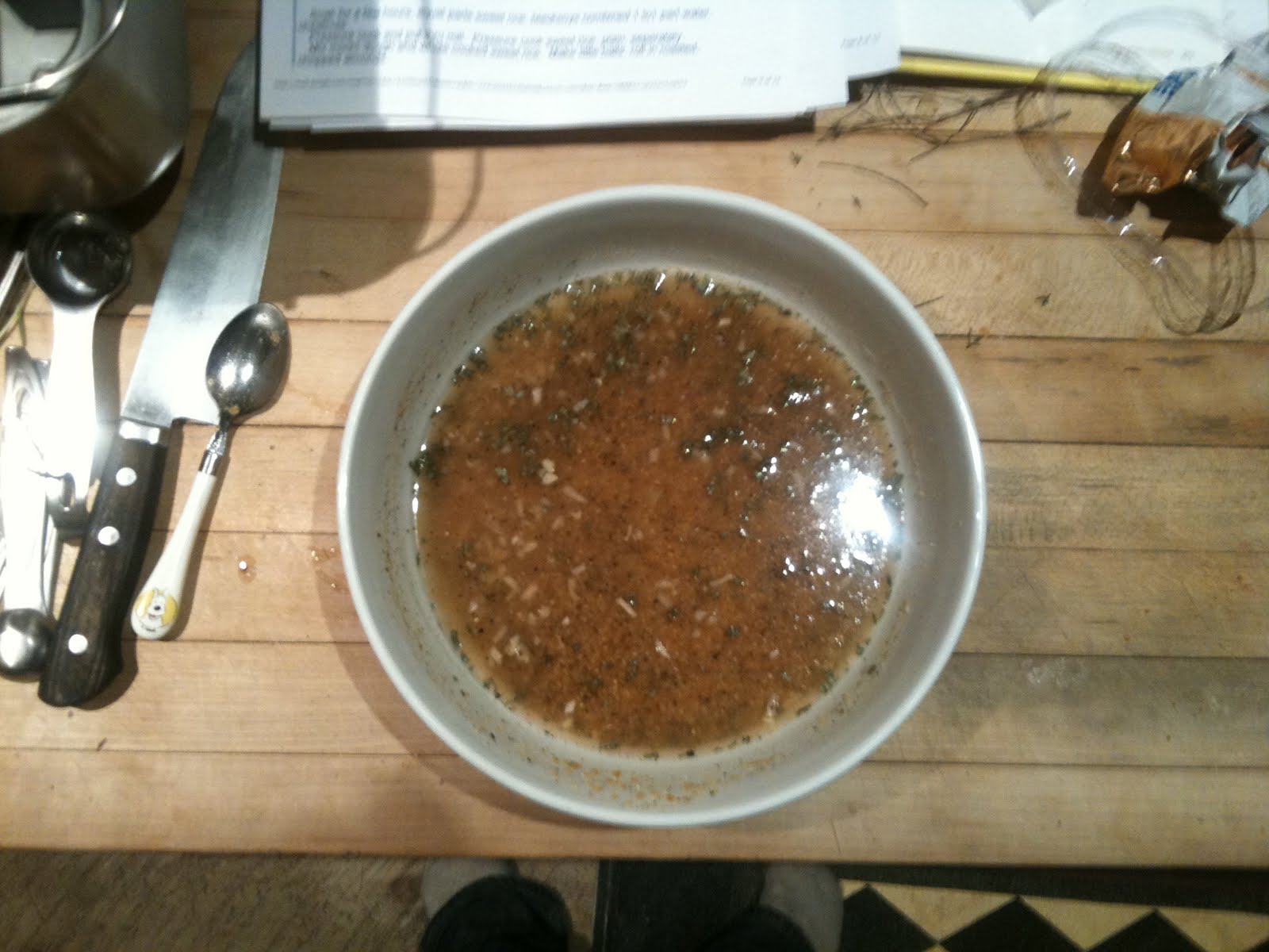 next in a bowl put the water, and all the herbs and spices and breadcrumbs. mix together into a kind of mush.