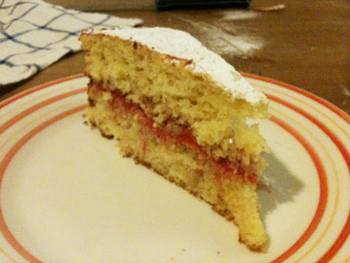 After the cake has cooled down, and the rhubarb has cooled down take a good amount of the rhubarb and put it on one side of the cake.  take the other cake and put it on top.  dust it with some powdered sugar!  and that’s all there is to it!