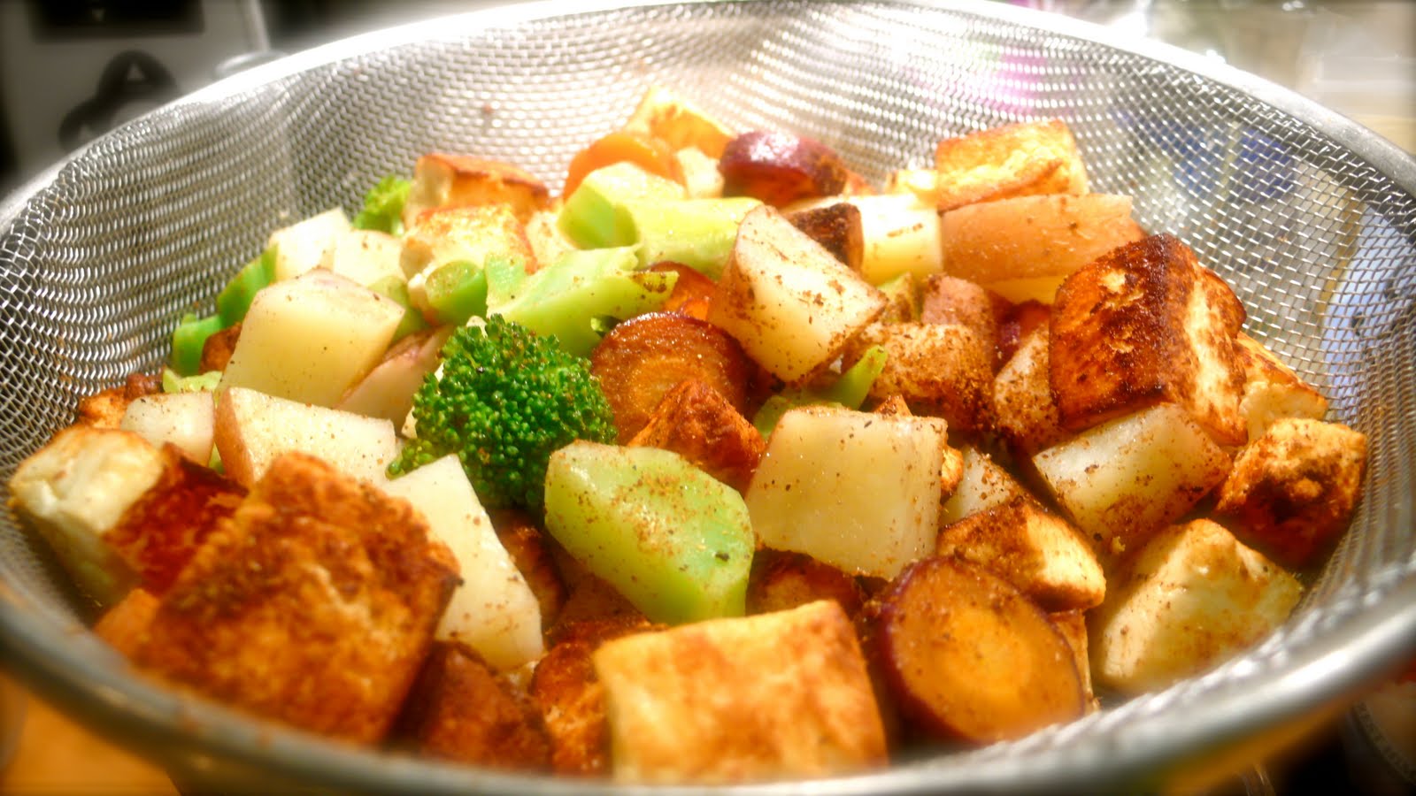 4. Heat the ghee and 1 tablespoon of olive oil in a pan. fry the paneer until it is golden brown on all sides. pour the paneer with ghee and all over the vegetables in the colander. While its still hot sprinkle some garam masala over them and toss.