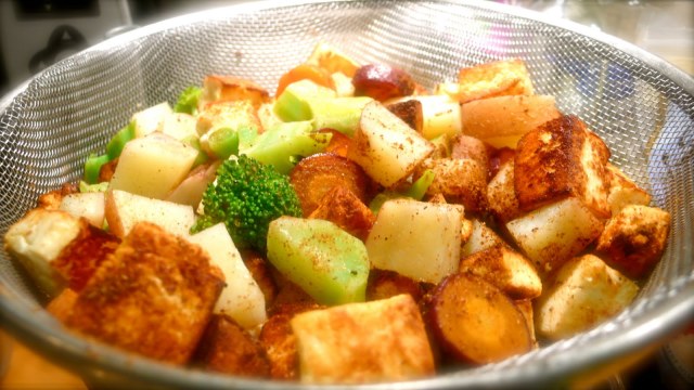 2. Cut all vegetables to equal sized pieces and parboil them. these will be cooked more later, so don’t overdo it now. strain and set aside in a colander.