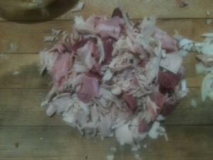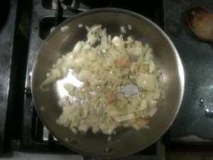 3. Heat back up the juice in the pan, and add the other half an onion plus 1 clove of garlic. Cook until its starting to get soft, then add the kale. Toss for a few seconds, then add the salt and pepper, plus the prunes. cover and cook for about 5 minutes. Set aside.