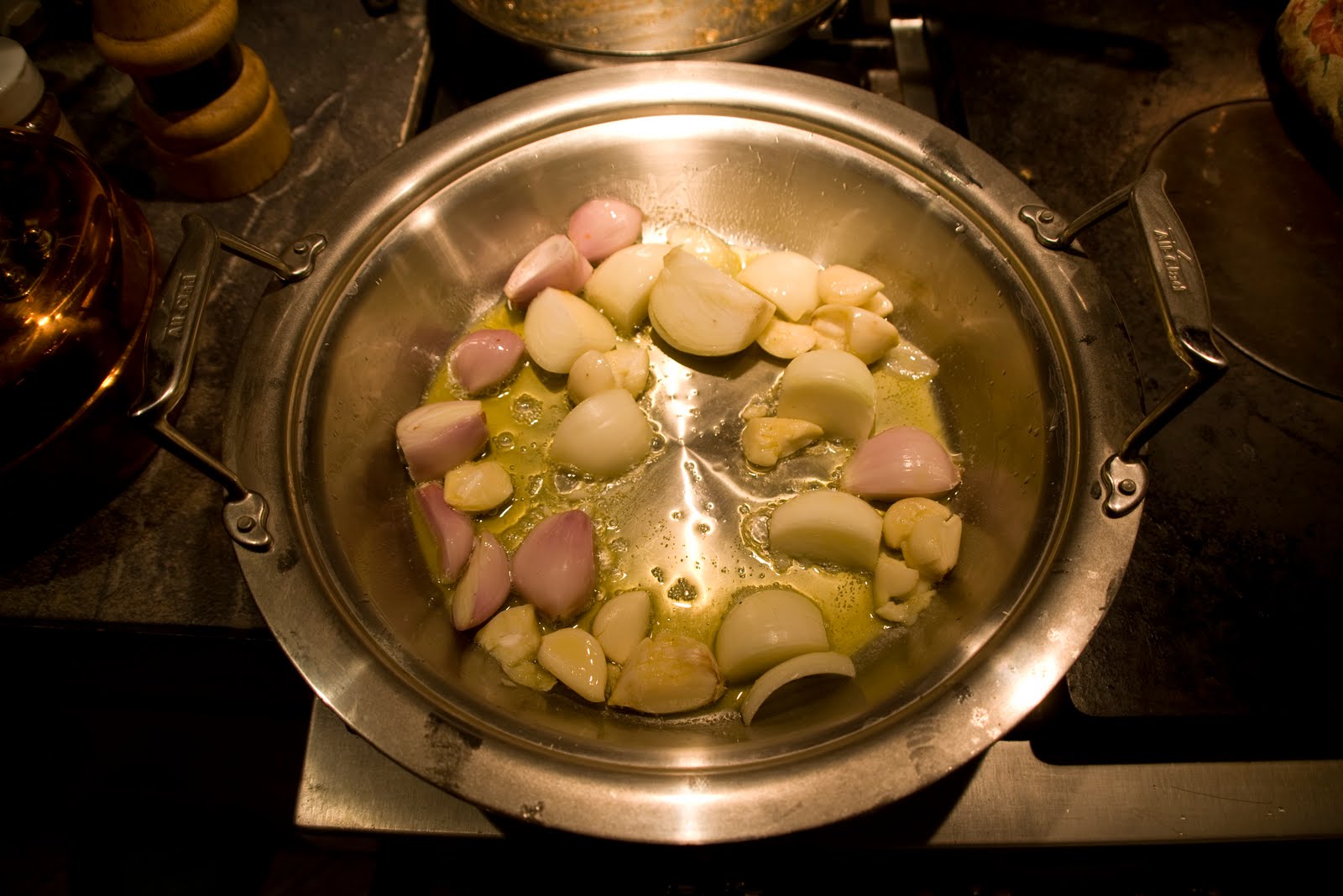 first take a couple good dregs of olive oil and start cooking the shallots and garlic over a medium heat.
