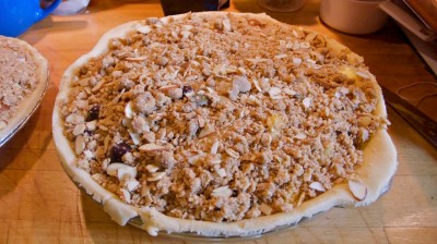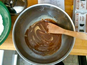 4. Pour the batter over all the apples, but do not stir. Let it cook for about 30 seconds on top of the stove, and then put it in the oven for 15 minutes. Do not open the oven at all during these 15 minutes, or it will deflate.